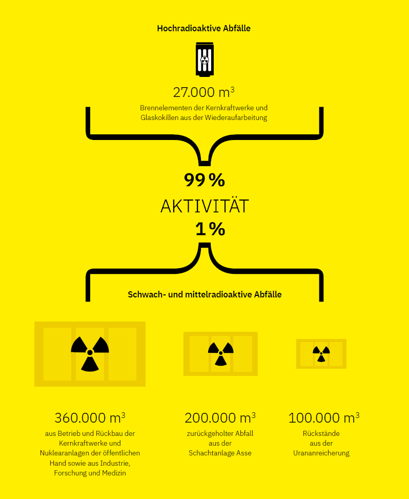 Hinzu kommen etwa 27.000 Kubikmeter hochradioaktiver Abfall. Dieser Abfall setzt sich zusammen aus abgebrannten Brennelementen aus Kernkraftwerken und Forschungsreaktoren sowie Glaskokillen aus der Wiederaufarbeitung. Das sind zwar nicht einmal fünf Prozent der Gesamtmenge – aber sie enthalten 99 Prozent der Aktivität.
