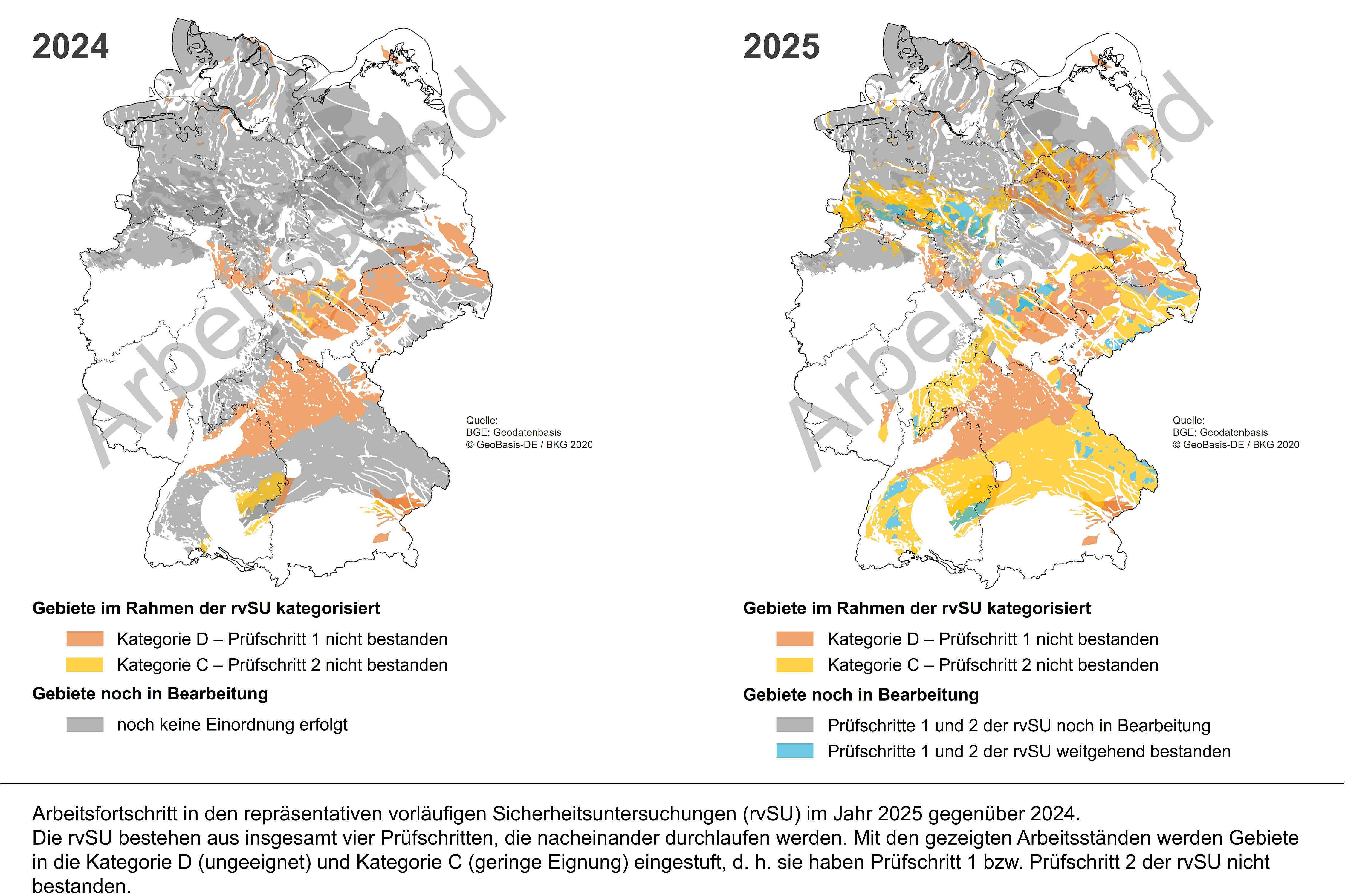 Von den insgesamt 90 Teilgebieten sind bereits 25 vollständig bearbeitet und weitere 11 in Teilen kategorisiert. 53 Prozent der Fläche aller Teilgebiete haben bereits Prüfschritt 1 oder 2 nicht bestanden. Sie sind damit in die Kategorien D oder C eingeordnet worden und werden von der BGE nicht weiter bearbeitet. Drei Prozent der Teilgebietsflächen haben die Prüfschritte 1 und 2 der rvSU weitgehend bestanden. 44 Prozent der Teilgebietsflächen stecken noch mitten in den Prüfschritten 1 und 2. Aufgeschlüsselt nach Wirtsgesteinen zeigt sich ein differenziertes Bild: Bei kristallinem Wirtsgestein konnten bereits rund 95 Prozent der Flächen als ungeeignet beziehungsweise gering geeignet kategorisiert werden, bei Steinsalz in flacher Lagerung rund 50 Prozent. Bei Tongestein wurden bisher etwa 30 Prozent der Flächen als ungeeignet beziehungsweise gering geeignet kategorisiert und bei Steinsalz in steiler Lagerung etwa 18 Prozent. Die Unterschiede erklären sich aus der Bearbeitungsreihenfolge der Teilgebiete, die sich aus projektplanerischen Gesichtspunkten wie zeitlicher Datenverfügbarkeit und -menge sowie effizienter Ressourcenallokation ergab.