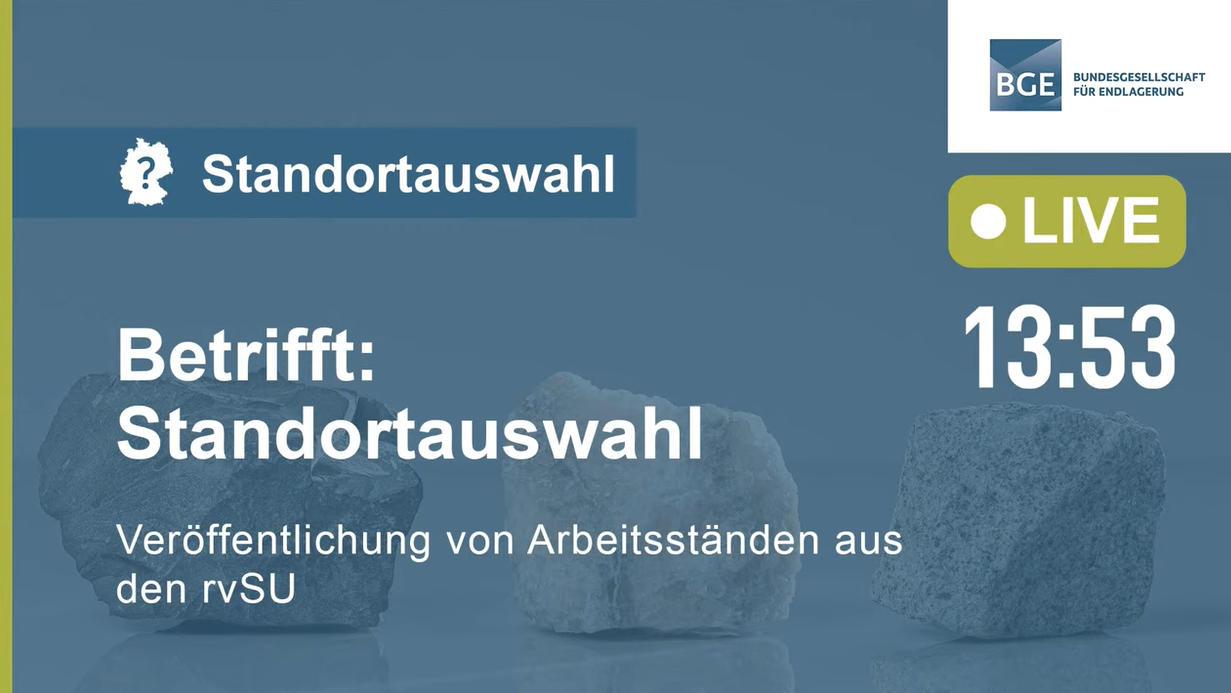 Neue Arbeitsstände und neue Funktionen im Endlagersuche Navigator: Das waren neben dem methodischen Vorgehen der BGE in den repräsentativen vorläufigen Sicherheitsuntersuchungen (rvSU) die Themen der Informationsveranstaltung „Betrifft: Standortauswahl“ am 3. November. Fast 600 Interessierte – die meisten davon bereits mit Vorwissen – nahmen über Zoom oder YouTube an dem Online-Format teil und stellten im Anschluss an die Präsentationen der BGE ihre Fragen.
