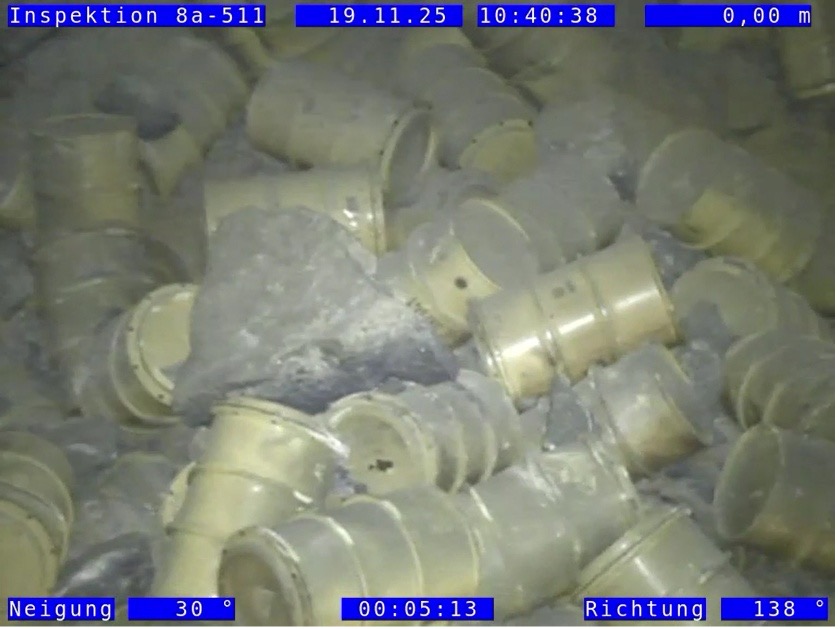 Am 19. November 2025 inspizierte die BGE erstmalig seit mehreren Jahrzehnten die Einlagerungskammer 8a auf der 511-Meter-Ebene mit einer Kamera. Die Bildaufnahmen zeigen, dass Teile der Kammerdecke (Firste), sogenannte Löser, auf die hier vor 50 Jahren eingelagerten Fässer gestürzt sind. Die Expert*innen der BGE untersuchen das umfangreiche Filmmaterial derzeit genauer.