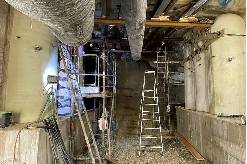 - 700-Meter-Ebene, Hauptverbindungsstrecke: Die Hauptverbindungsstrecke soll hier zukünftig einen anderen Verlauf nehmen. Dafür müssen Bergleute unter anderem Rohrleitungen umlegen und Platz für eine Ventilstation schaffen. Über diese wird der Materialtransport in den im Bergwerk verbauten Rohrleitungen geregelt. Dazu errichten Bergleute im September einen Sockel aus Spezialbeton. Gleichzeitig erstellen sie ein neues Fundament für den Einbau eines Wettertors. Wettertore lenken die Frisch- und Abluft im Bergwerk.