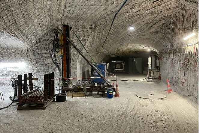 - 800-Meter-Ebene, PAE-Feld: Die letzten offenen Streckenbereiche des ehemaligen Versuchsfeldes sollen in diesem Jahr mit Beton verfüllt werden. Dazu bereiten Bergleute die Streckenabschnitte vor, indem sie hier eingebaute Rohre und Leitungen entfernen und noch offene Bohrlöcher mit Beton verfüllen. Bevor der Bereich abgeworfen wird, werden Bergleute auch die Leitern aus der von hier ausgehenden Fluchtbohrung zur 750-Meter-Ebene entfernen. Im Bereich des PAE-Versuchsfeldes fanden bis Ende der 90er-Jahre Versuche statt, bei denen der Einfluss von Wärme auf das umliegende Salz untersucht wurde.