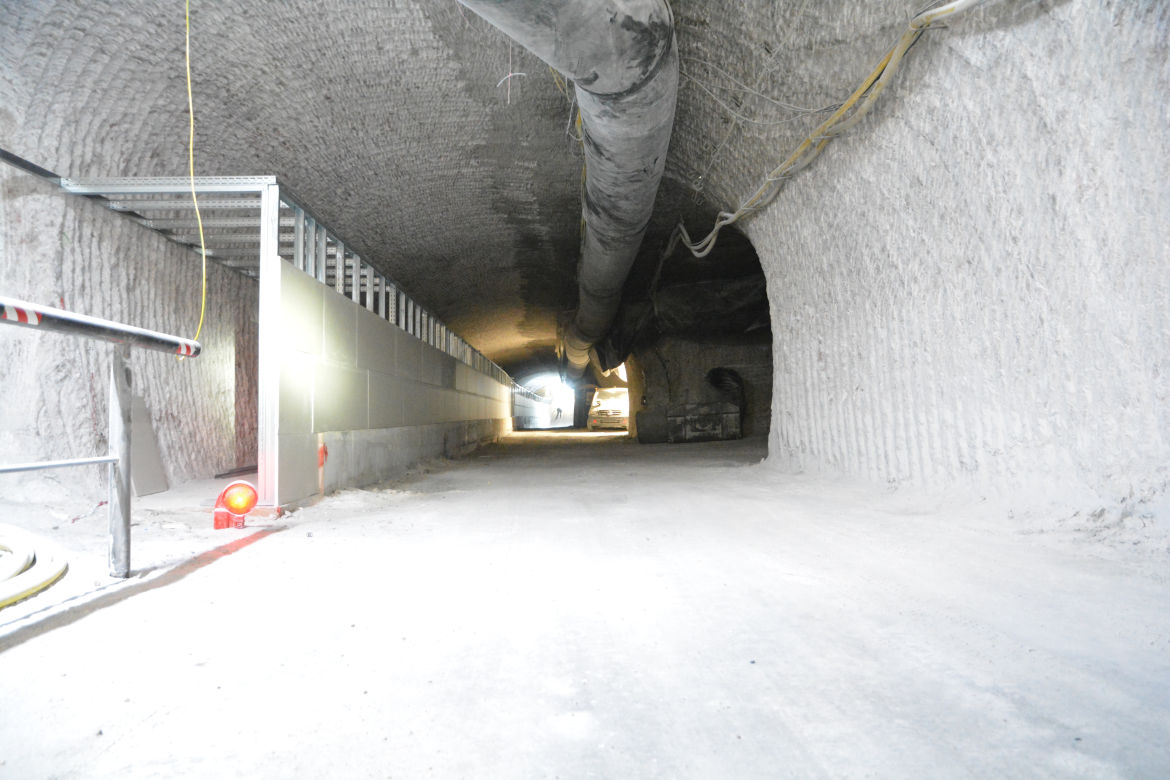 - Auf der 595-Meter-Ebene bringen Mitarbeiter mit einer Baustoffanlage, die sich auf der 511-Meter-Ebene befindet, Salzbeton in den eingeschalten Bereich der Abbaubegleitstrecke im Firstniveau ein. Bis jetzt wurden rund 3.100 Kubikmeter Sorelbeton eingebracht.