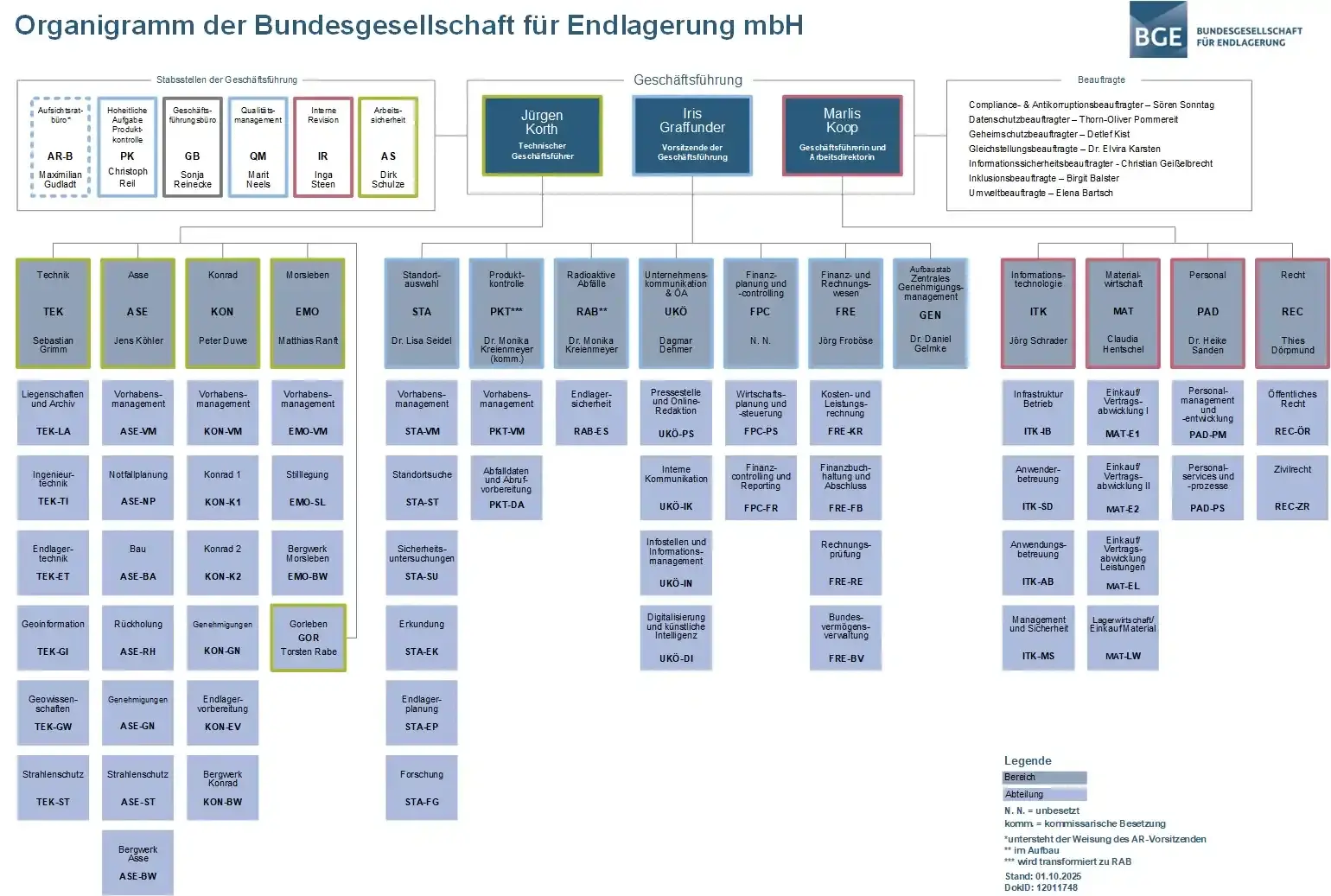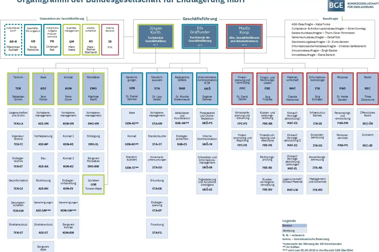 Die Arbeit und die Organisationsform der BGE begründen sich aus dem Atomgesetz (§ 9a Abs. 3 S. 2 AtG, externer Link) und dem Standortauswahlgesetz (StandAG, externer Link). Alleinige Gesellschafterin ist die Bundesrepublik Deutschland. Eine Gewinnorientierung besteht nicht. Ein gemäß Mitbestimmungsgesetz paritätisch mit Vertreter*innen der Anteilseignerin und der Arbeitnehmer*innen besetzter Aufsichtsrat kontrolliert die Arbeit des Unternehmens.