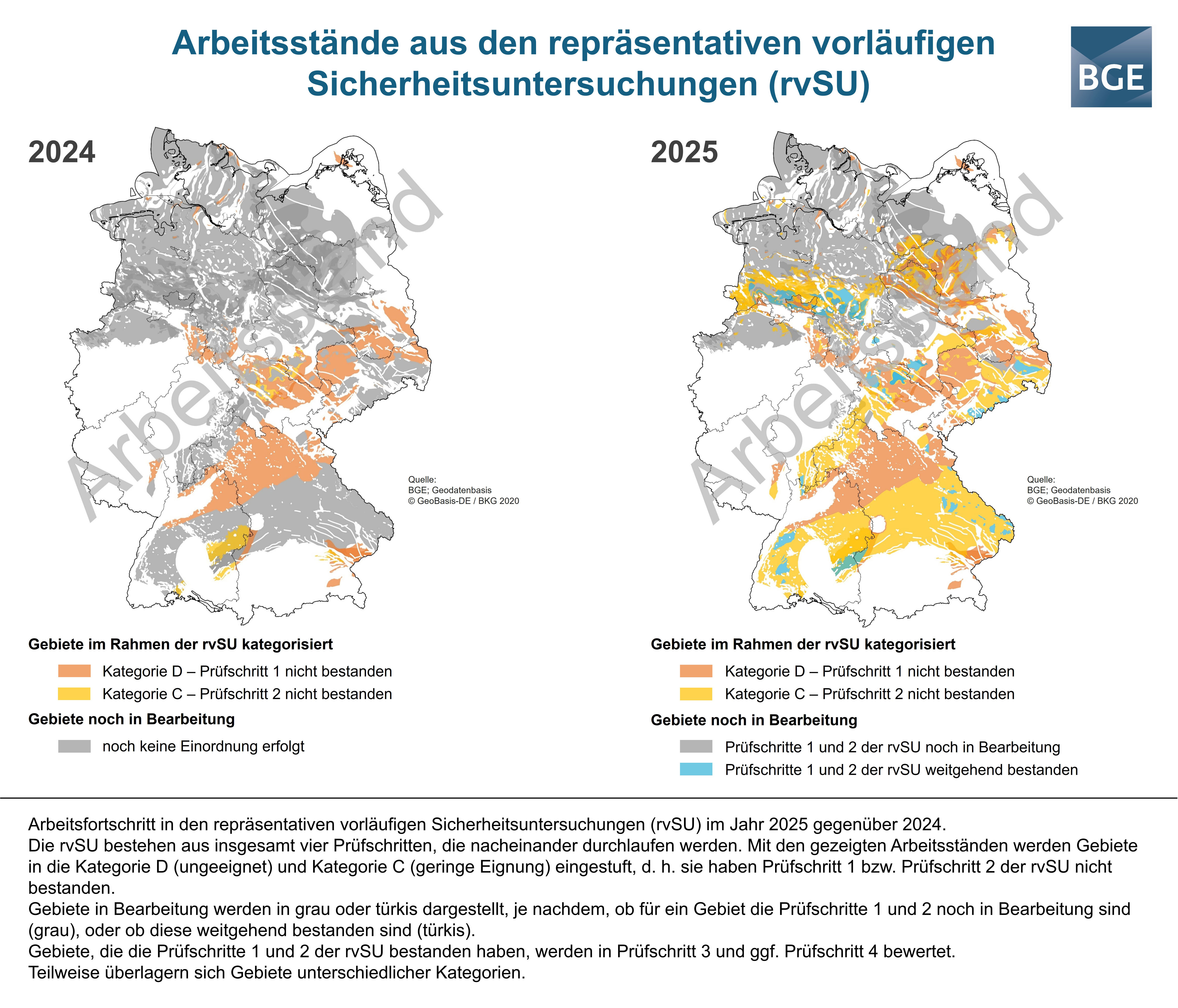 Die Vorsitzende der BGE-Geschäftsführung Iris Graffunder sagte anlässlich der Veröffentlichung: „Wir halten Wort und veröffentlichen wie im Vorjahr unsere aktuellen Arbeitsstände. So können alle Menschen sehen, dass es mit der Endlagersuche voran geht und wie es in ihrer Region derzeit aussieht.“ Bereits 2024 hatte die BGE einen Arbeitsstand veröffentlicht, im Jahr 2026 ist eine weitere Veröffentlichung geplant. Ende 2027 will die BGE dann einige wenige Standortregionen für die übertägige Erkundung vorschlagen, die vor Ort durch Anwendung von geowissenschaftlichen Messmethoden, wie Schallwellen in den Untergrund (3D-Seismik) und Bohrungen, auf ihre Eignung weitergehend untersucht werden sollen.