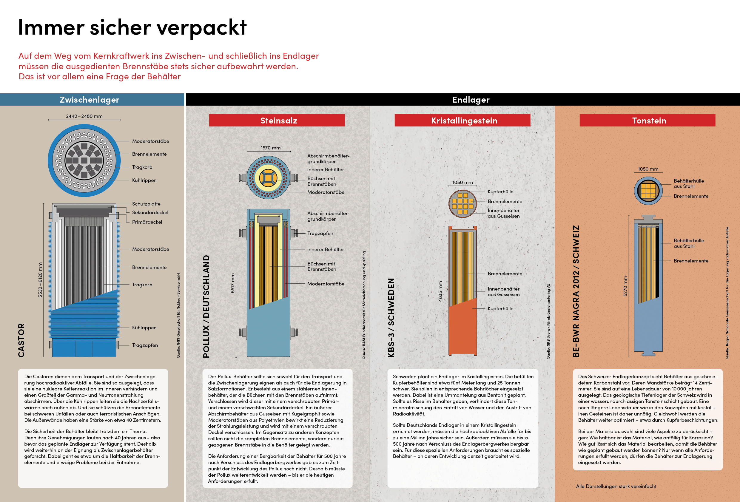 Jedes Gestein erfordert nämlich einen individuellen Endlagerbehälter, weil dessen Charakteristika eng auf die Eigenschaften des umgebenden Gebirges abgestimmt sein müssen. Der Behälter ist also stets nur ein Teil eines ganzheitlichen und standortspezifischen Endlagerkonzeptes. Etwa weil die Wärmeableitung – ein wichtiger Aspekt bei der Endlagerung – vom Wirtsgestein abhängt. Weil man mit der Behälterentwicklung aber nicht warten kann, bis in Deutschland die Entscheidung über das Wirtsgestein gefallen ist, geschieht diese nun bereits parallel.