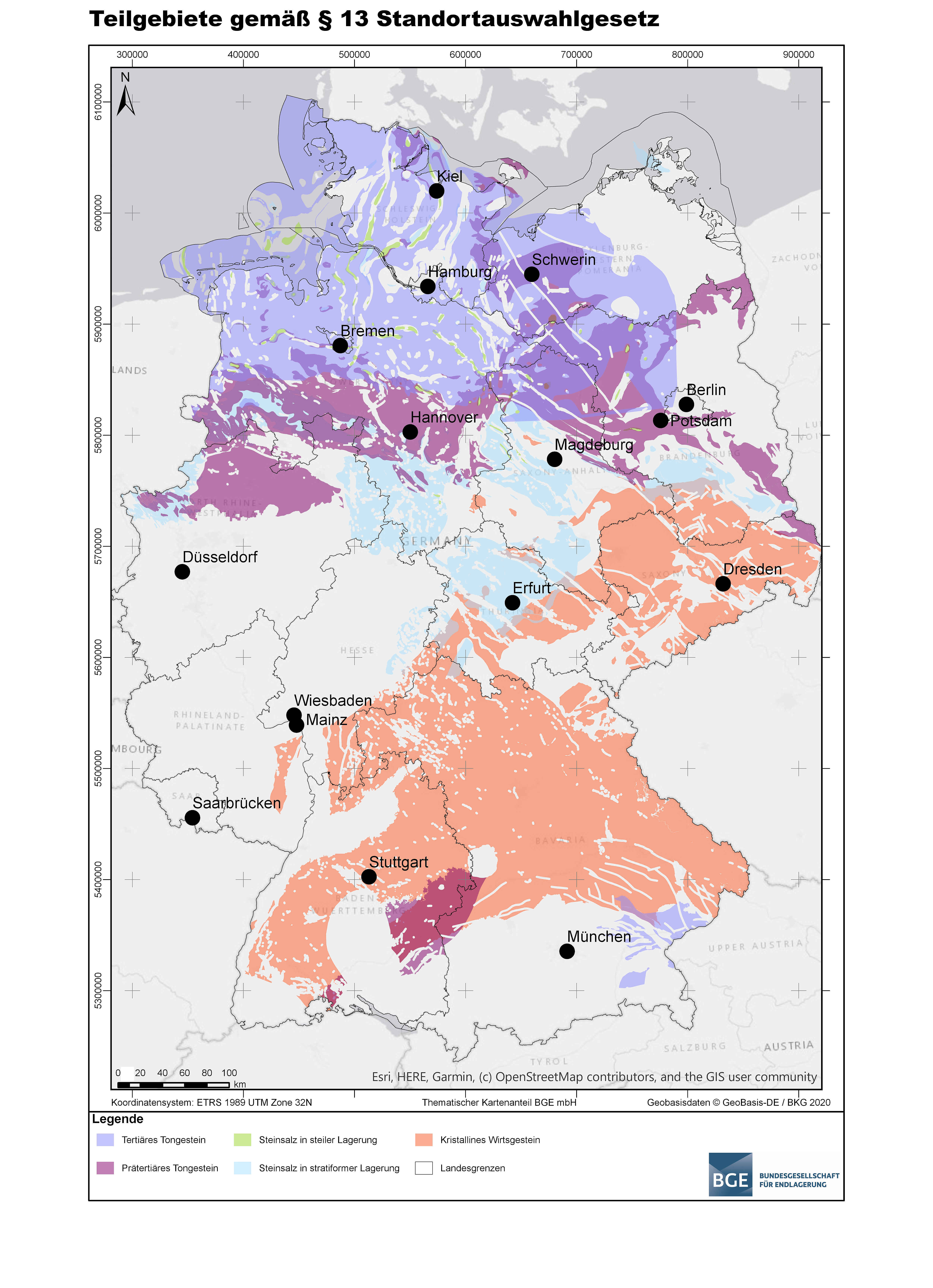 Für jedes der 90 Teilgebiete und je vorläufigem Sicherheitskonzept wird grundlegend ein Untersuchungsraum ausgewiesen. Liegen in einem Teilgebiet mehrere Schichten des gleichen Wirtsgesteins übereinander, die für sich jeweils alle Mindestanforderungen erfüllen, werden mehrere Untersuchungsräume ausgewiesen. Die einfache Formel lautet: Jedes Teilgebiet ist gleichzeitig räumlich auch ein Untersuchungsraum.
