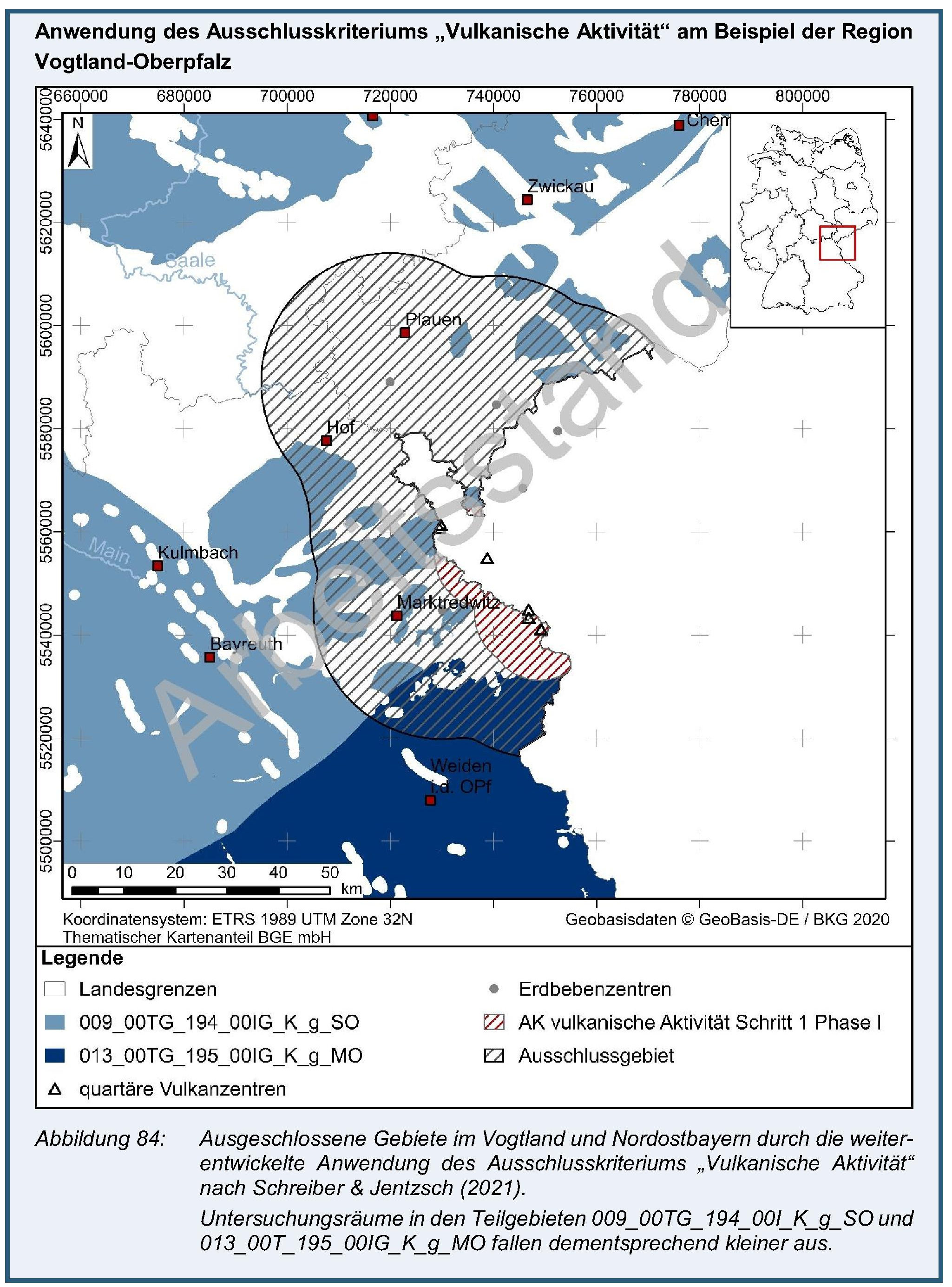 Eine Studie im Auftrag der BGE zur Bewertung möglicher vulkanischer Aktivitäten (PDF, 50 MB) hat etwa ergeben, dass neben den bereits in Schritt 1 der Phase I identifizierten Vulkanen mit erhöhter Wahrscheinlichkeit einer vulkanischen Aktivität innerhalb der nächsten eine Million Jahre, einzelne weitere Vulkane berücksichtigt werden sollten. Ein weiteres Ergebnis der Untersuchung: Der Sicherheitsabstand von 10 Kilometer sollte auf 25 Kilometer erhöht werden.