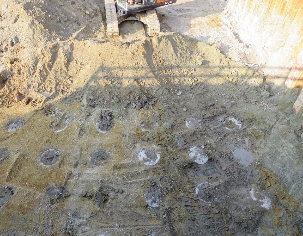 Ein Dienstleister hat in der 12. Kalenderwoche begonnen in der Baugrube der Umladehalle Großbohrlöcher zu erstellen. Diese haben einen Durchmesser von 0,77 Meter und werden 16 Meter tief gebohrt. Die insgesamt 268 Bohrungen dienen der Bodenverbesserung im Bereich der zukünftigen Umladehalle.
