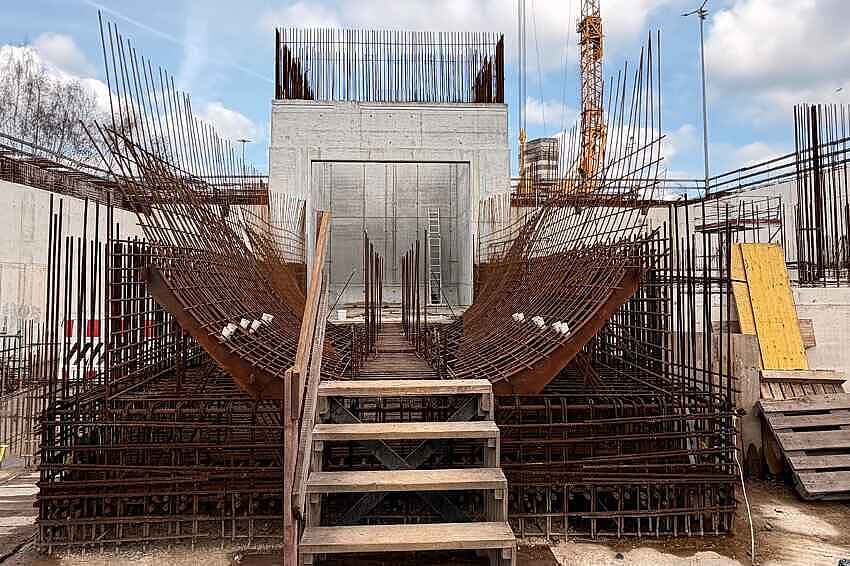 - Mitarbeiter*innen einer Baufirma setzen die Fundamentarbeiten am Bauabschnitt A2 der Umladehalle fort. Bauleute führen die Arbeiten am Lüftergebäude fort. Ein Schwerpunkt bildet die Vorbereitung für die Betonage des Abluftkamins (Diffusor).